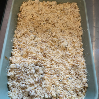Cut the butter in small pieces. Roughly chop the walnut. Mix the crumble ingredients in a bowl with hands until you get a gritty texture.