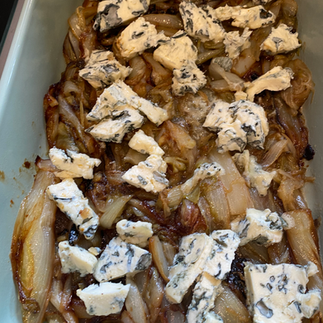 In an oven dish, spread the chicory. Crumble the blue cheese then spread the crumble mixture.