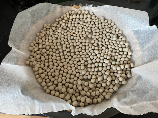 Preheat the oven at 180C. Brush a baking tray with olive oil. Roll out the dough. Put it in the baking tray. Cover the dough with a baking paper and weights. Cook in the oven for 10 minutes. Uncover and cook for 5 more minutes.