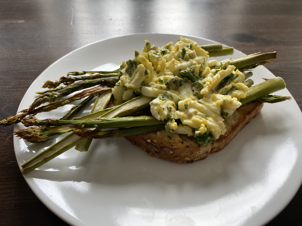 Toast and lightly butter the bread. Top each slice with asparagus and finish with a pile of herby eggs