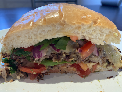 Kidney beans, mushrooms and red onion patty. Conte cheese, chopped tomatoes, red onions, chilli powder and lime sauce. Sliced avocado, topped with coriander