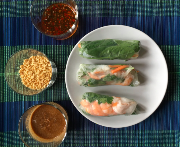 Fill a large bowl with warm water. Dip one wrapper into the water for 1 second to soften. Lay wrapper flat. In a row across the centre, place 2 prawn halves, a handful of noodles, carrot sticks, scallion sticks, basil, mint, coriander and spinach, leaving about 5cm uncovered on each side
